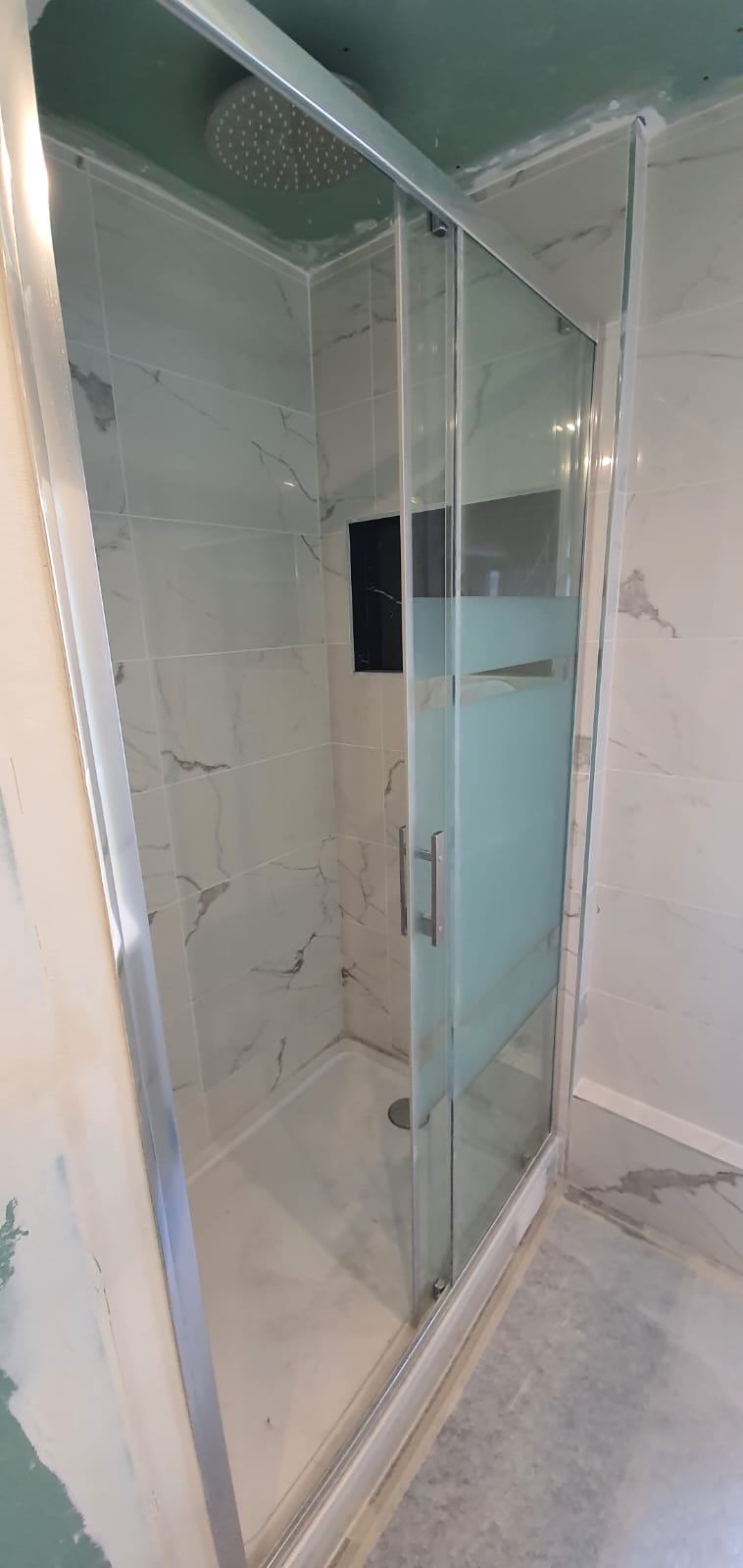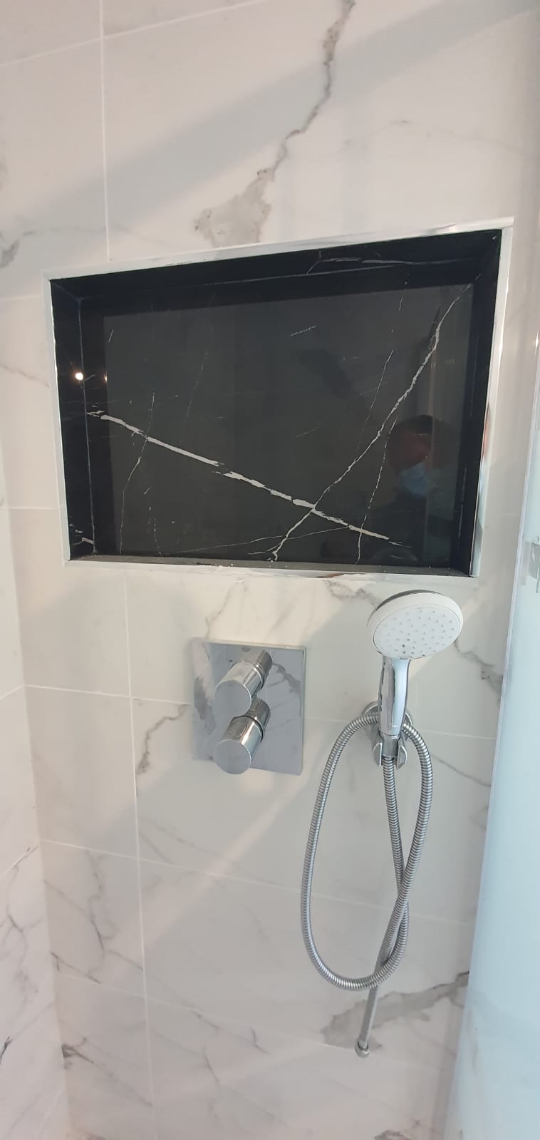 Reconfiguration d'une salle de bain en salle d'eau privative avec la création d'une douche à encastrement du mitigeur, pose d'un WC suspendu et d'un meuble vasque avec ses rangements. Pose de carrelage imitation marbre pour un effet sobre et lumineux.