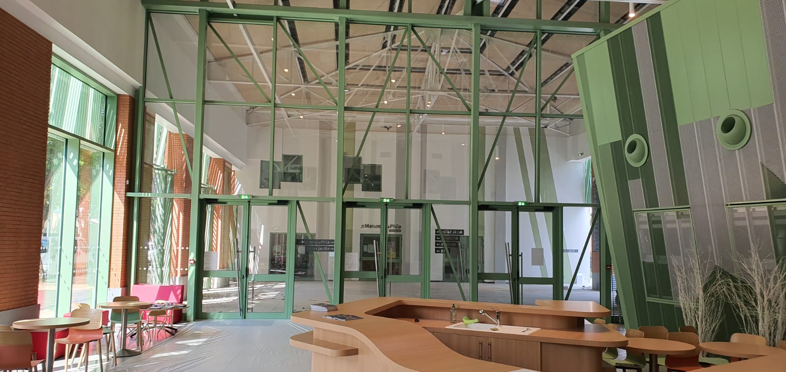 Réalisation des différents ravalements de façades du Palais des fêtes de Romainville d'une surface totale de plus de 3 000m². À la demande de l'architecte, nous avons réalisé en peinture des formes géométriques et le traitement des briques existantes afin de leurs donner un nouvel éclat. Nous avons procédé à l'isolation thermique extérieure avec une finition décorative, tout en couleur.