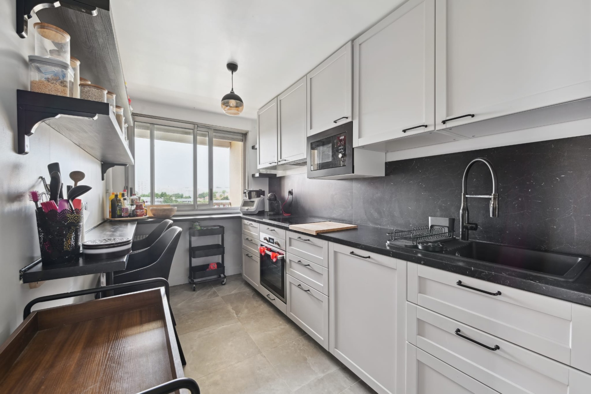 Rénovation d'un appartement avec création d'une nouvelle installation électrique, pose de nouveaux revêtements de sol (parquet et carrelage), et réfection totale des peintures. Aménagement d'une nouvelle salle de bain et pose d'une cuisine équipée.