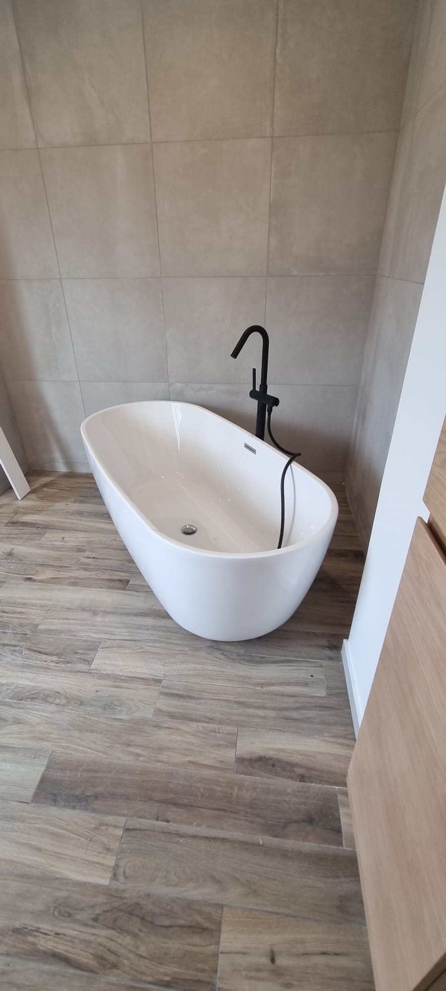 Réfection d'une salle de bain avec un espace totalement reconfiguré selon les souhaits du client. Création d'un faux plafond et doublage des murs pour une meilleure isolation et reprise complète de l'installation de plomberie. Nous avons effectué la pose d'une baignoire à îlot avec mitigeur sur pied, créé un espace douche et posé un meuble vasque épuré et moderne.
